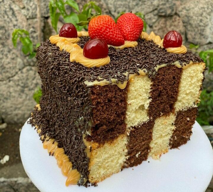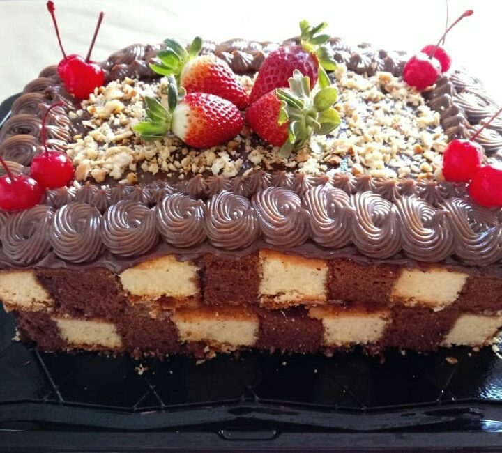 Feito com camadas alternadas de massa clara e escura, este bolo cria um visual xadrez irresistível ao ser cortado. Além de ser delicioso, o Bolo Xadrez é perfeito para impressionar seus convidados em qualquer ocasião especial. Venha provar essa delícia e deixe-se encantar por cada fatia!